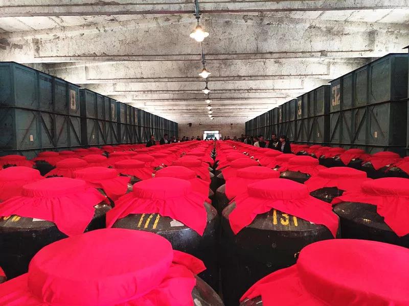 大家在半成品酒庫參觀大如草房子的酒海子,品嘗貯藏了三十多年色澤微黃、香氣撲鼻的老酒。