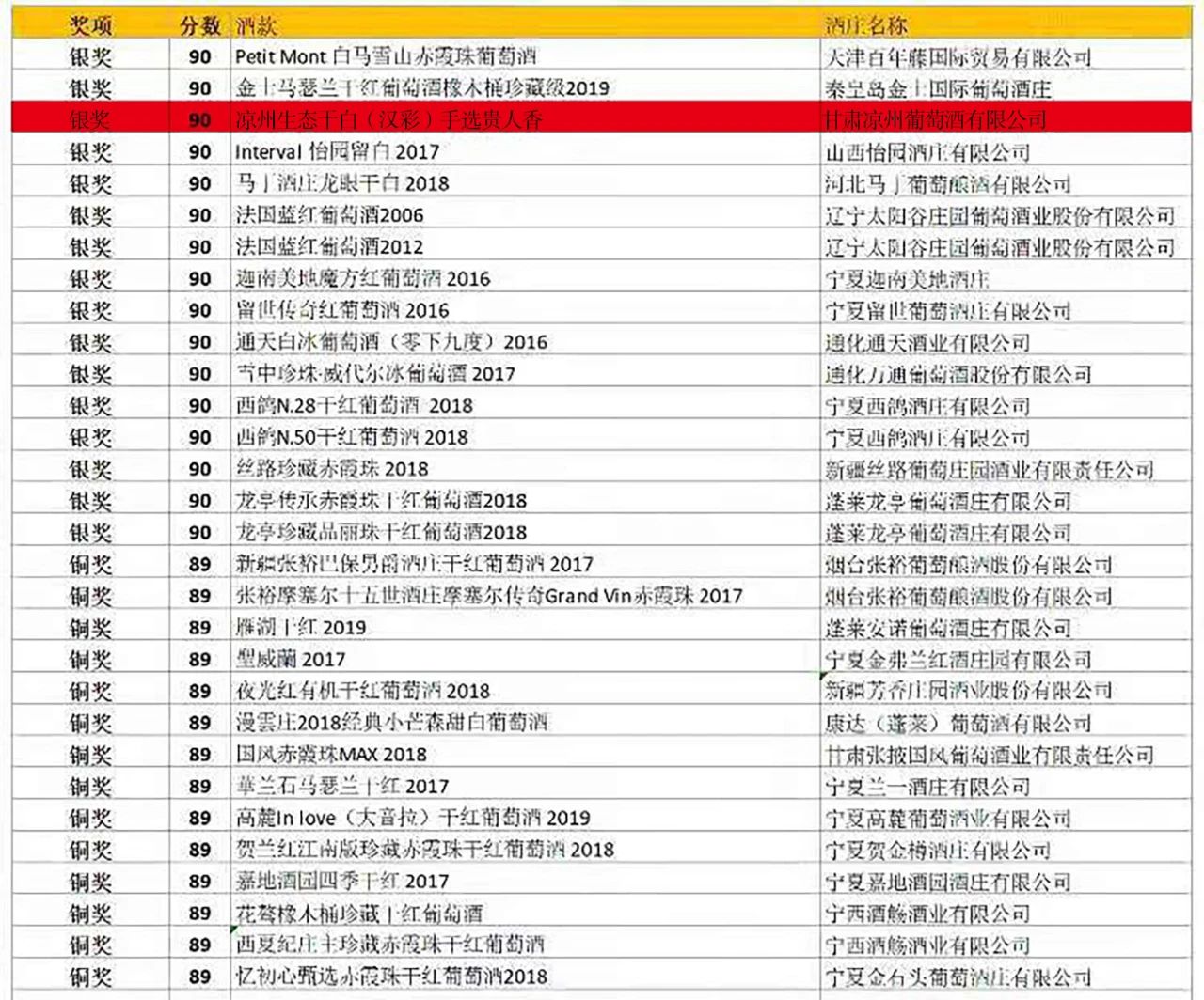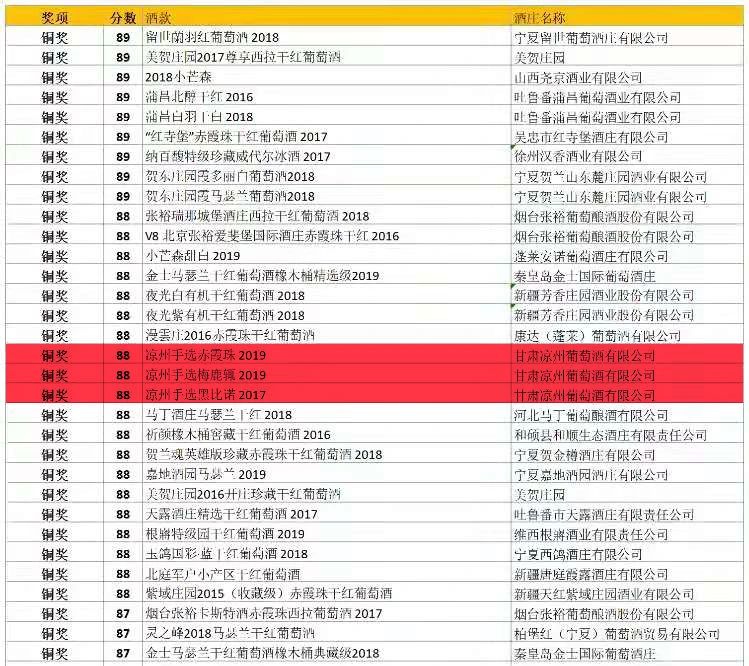 涼州生態(tài)干白(漢彩)手選貴人香榮獲銀獎,涼州手選梅特林、涼州手選赤霞珠2019、涼州手選梅鹿輒2019、涼州手選黑比諾2017四款葡萄酒榮獲銅獎。