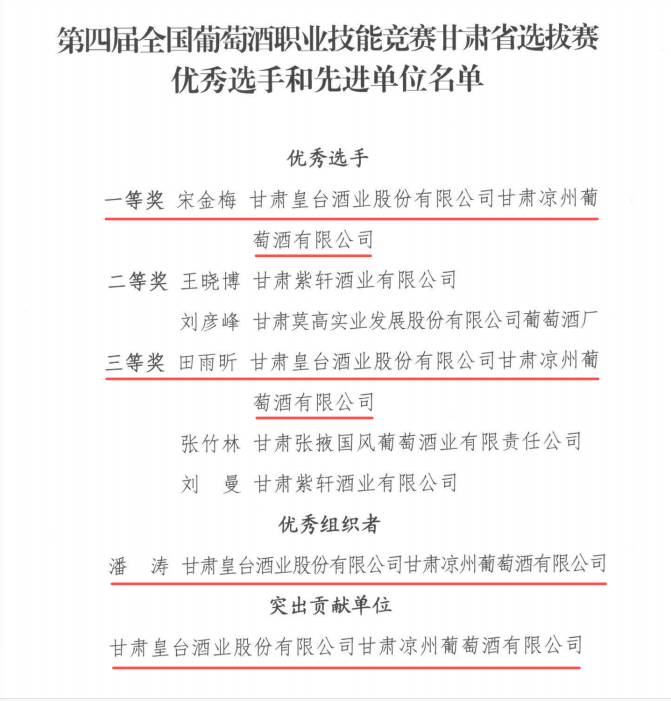 近日,甘肅省釀酒工業(yè)協(xié)會和甘肅省經貿工會工作委員會聯合下發(fā)了《關于第四屆全國葡萄酒職業(yè)技能競賽甘肅省選拔賽優(yōu)秀選手和先進單位的通報》,對在全國決賽和甘肅省選拔賽中成績優(yōu)異選手、優(yōu)秀組織者以及為技能競賽作出突出貢獻的甘肅皇臺酒業(yè)股份有限公司甘肅涼州葡萄酒有限公司予以通報表彰。