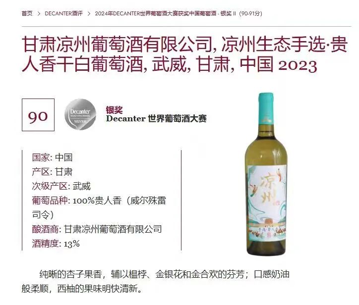 涼州生態(tài)手選·貴人香干白葡萄酒在Decanter世界葡萄酒大賽中榮獲銀獎(jiǎng)