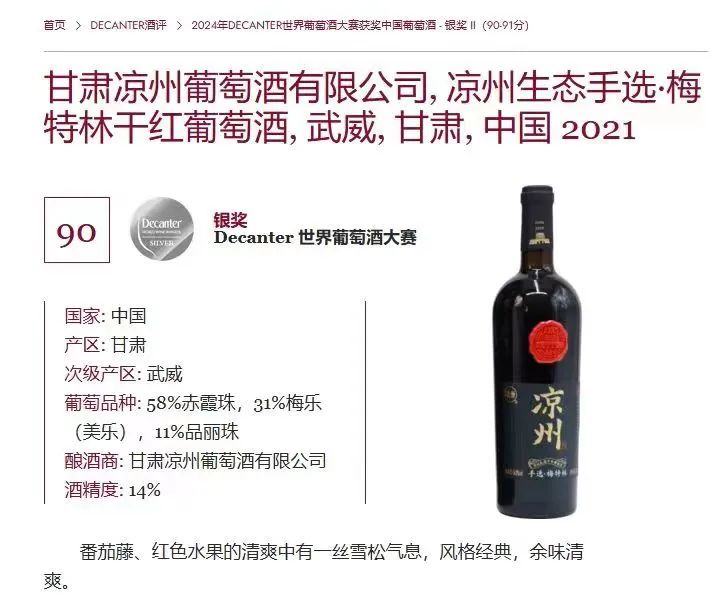 涼州生態(tài)手選·梅特林干紅葡萄酒在Decanter世界葡萄酒大賽中榮獲銀獎(jiǎng)