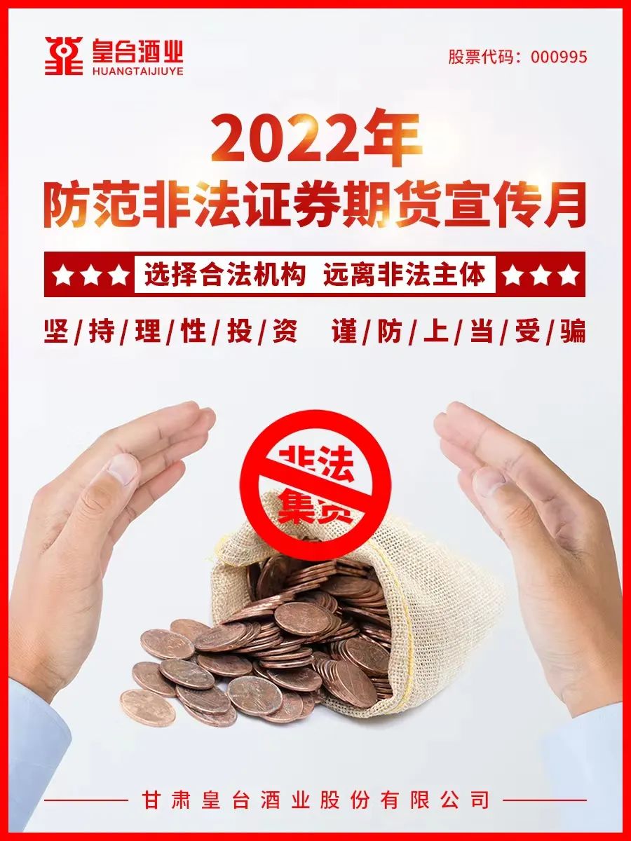 防范非法證券期貨工作是一項(xiàng)長期、復(fù)雜、艱巨的系統(tǒng)工程,甘肅皇臺酒業(yè)股份有限公司將以“5.15全國投資者保護(hù)宣傳日”為契機(jī),認(rèn)真總結(jié)活動經(jīng)驗(yàn),推動防范非法證券期貨宣傳教育工作的常態(tài)化和規(guī)范化,持續(xù)提升社會公眾風(fēng)險意識,履行社會責(zé)任。
