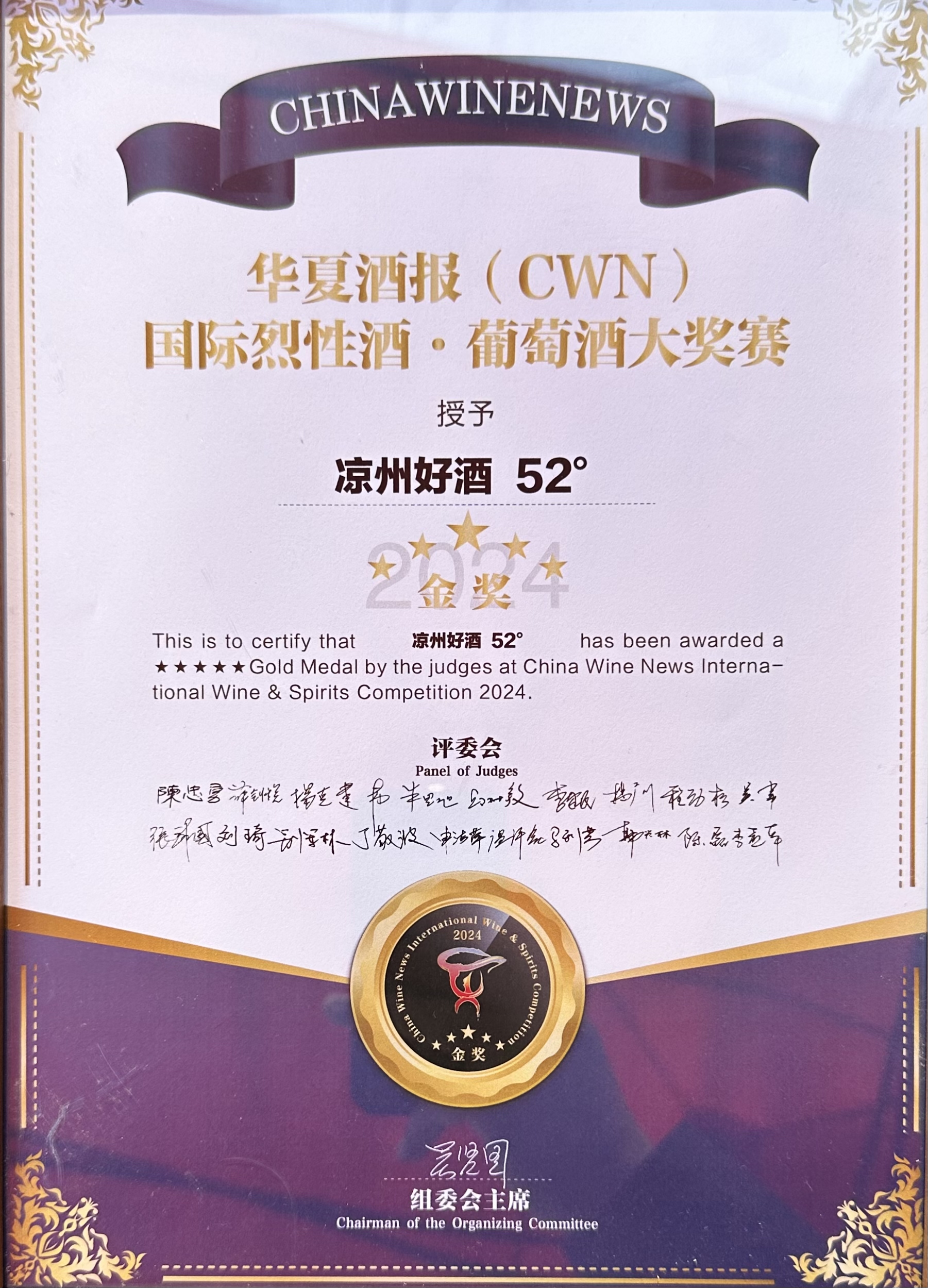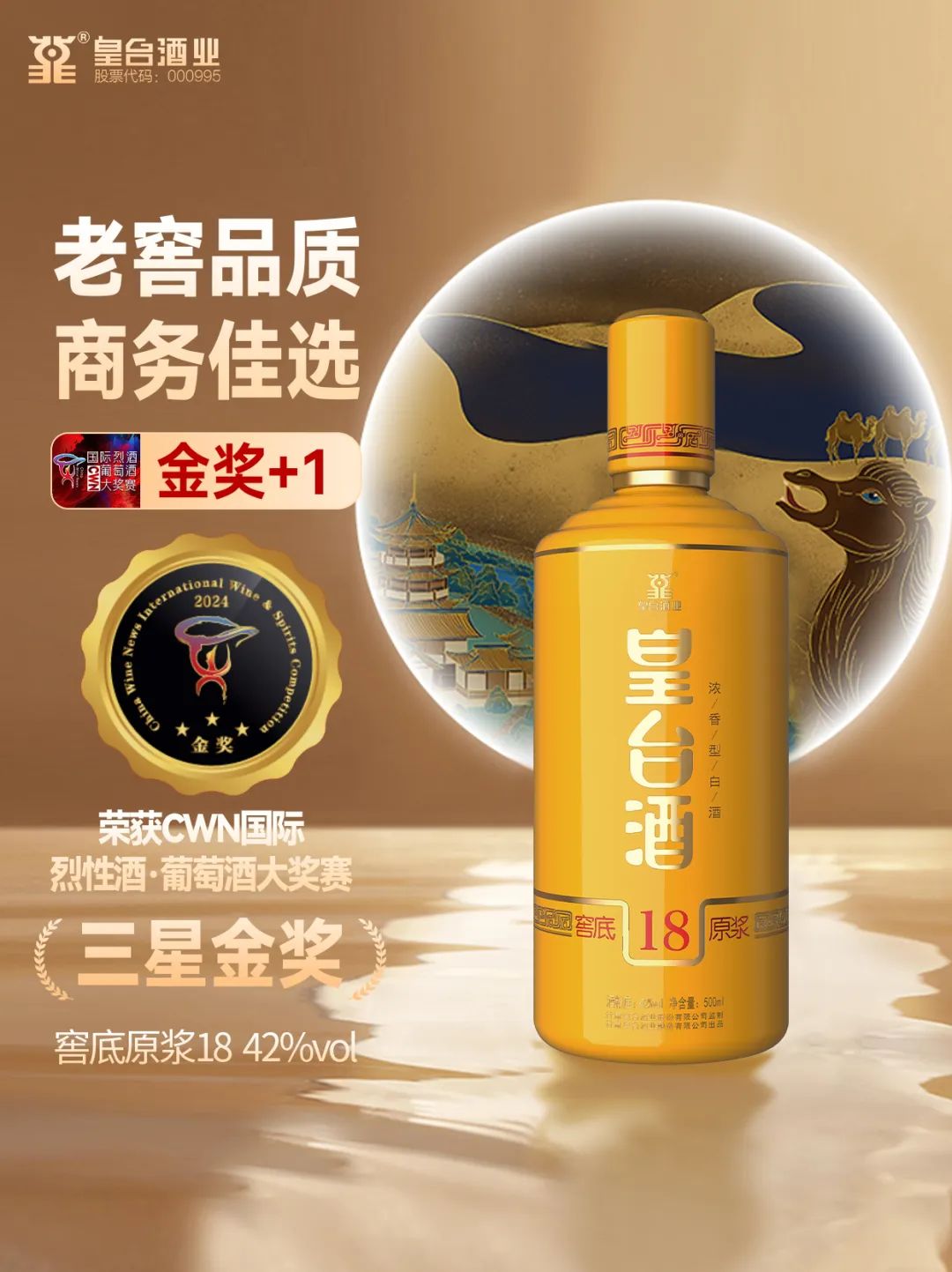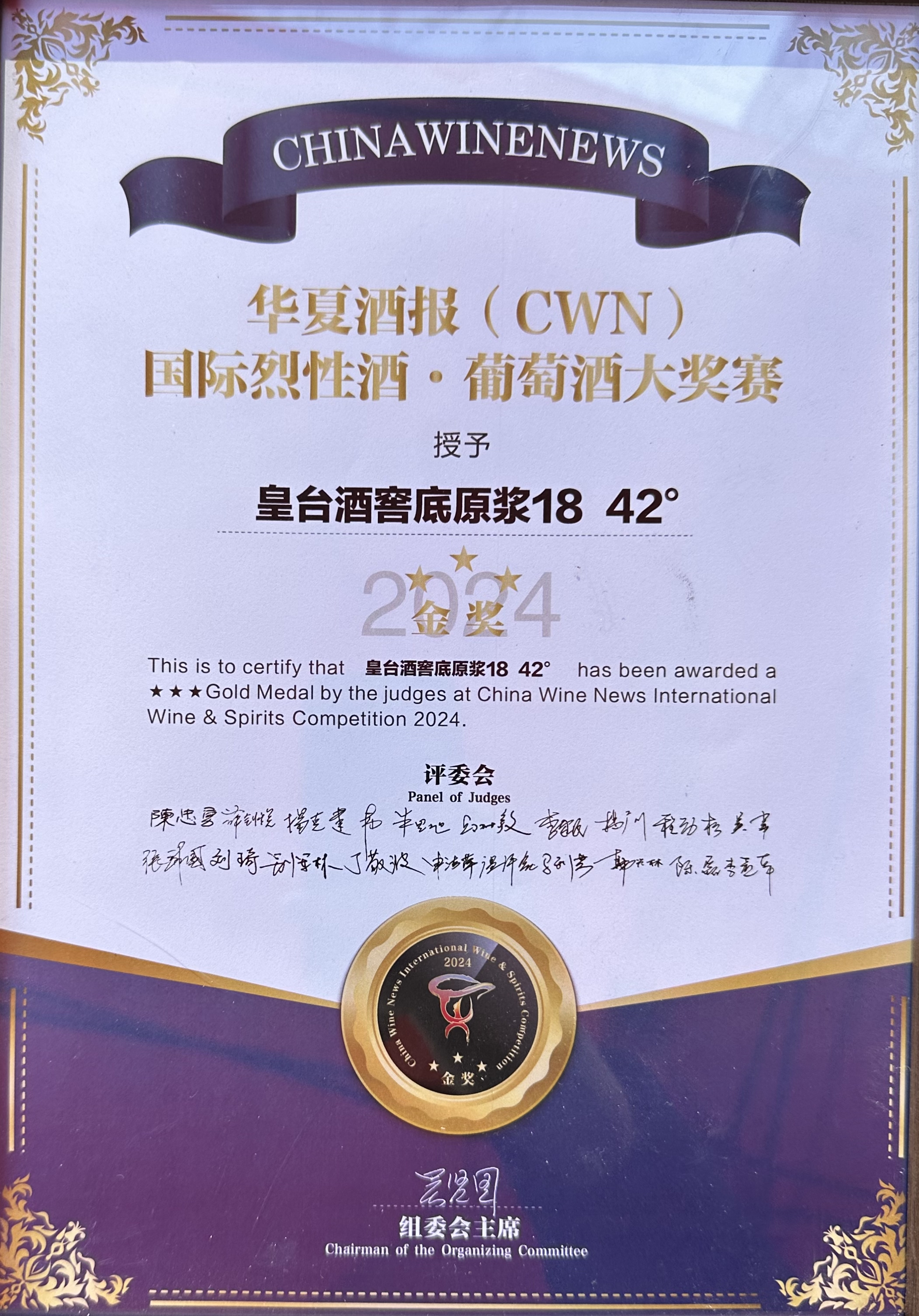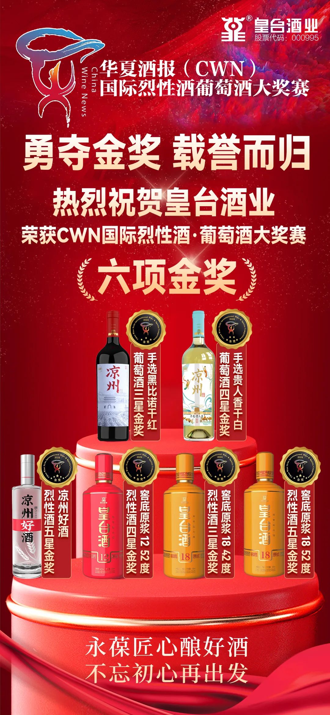 在第二屆CWN國際烈性酒·葡萄酒大獎賽頒獎盛典上,52度涼州好酒在烈性酒A類(價格在< 200元組)榮捧金獎;52度皇臺窖底原漿12和42度窖底原漿18兩款產(chǎn)品在B類(價格在<200-499元組)中榮捧金獎;52度皇臺窖底原漿18在C類(價格在500—799元組)中榮捧金獎。