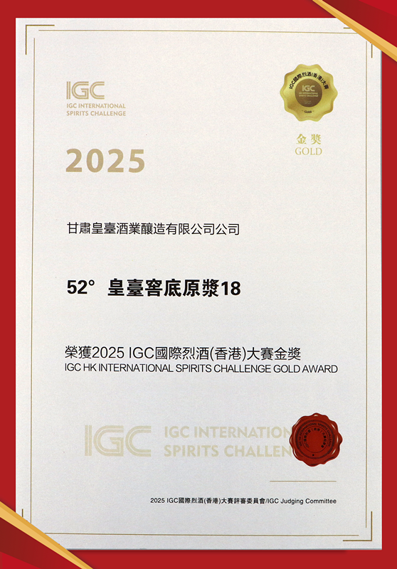 5月20日,2025年IGC國際烈酒(香港)大賽的頒獎典禮在廣州隆重舉辦。在此次頒獎盛會上,皇臺52度窖底原漿18榮獲金獎,皇臺52度窖底原漿16榮獲銀獎。