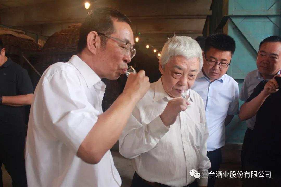 酒業(yè)中國流通協(xié)會副會長劉員(前排右一)、甘肅省酒業(yè)管理局局長陳浦(前排左一)在半成品酒庫品鑒皇臺陳釀30年