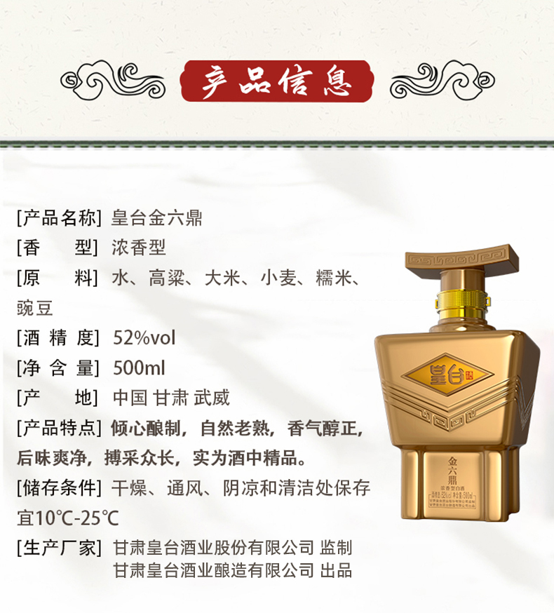 品名:皇臺酒52度金六鼎濃香型純糧食釀造白酒送禮500ml瓶禮盒裝