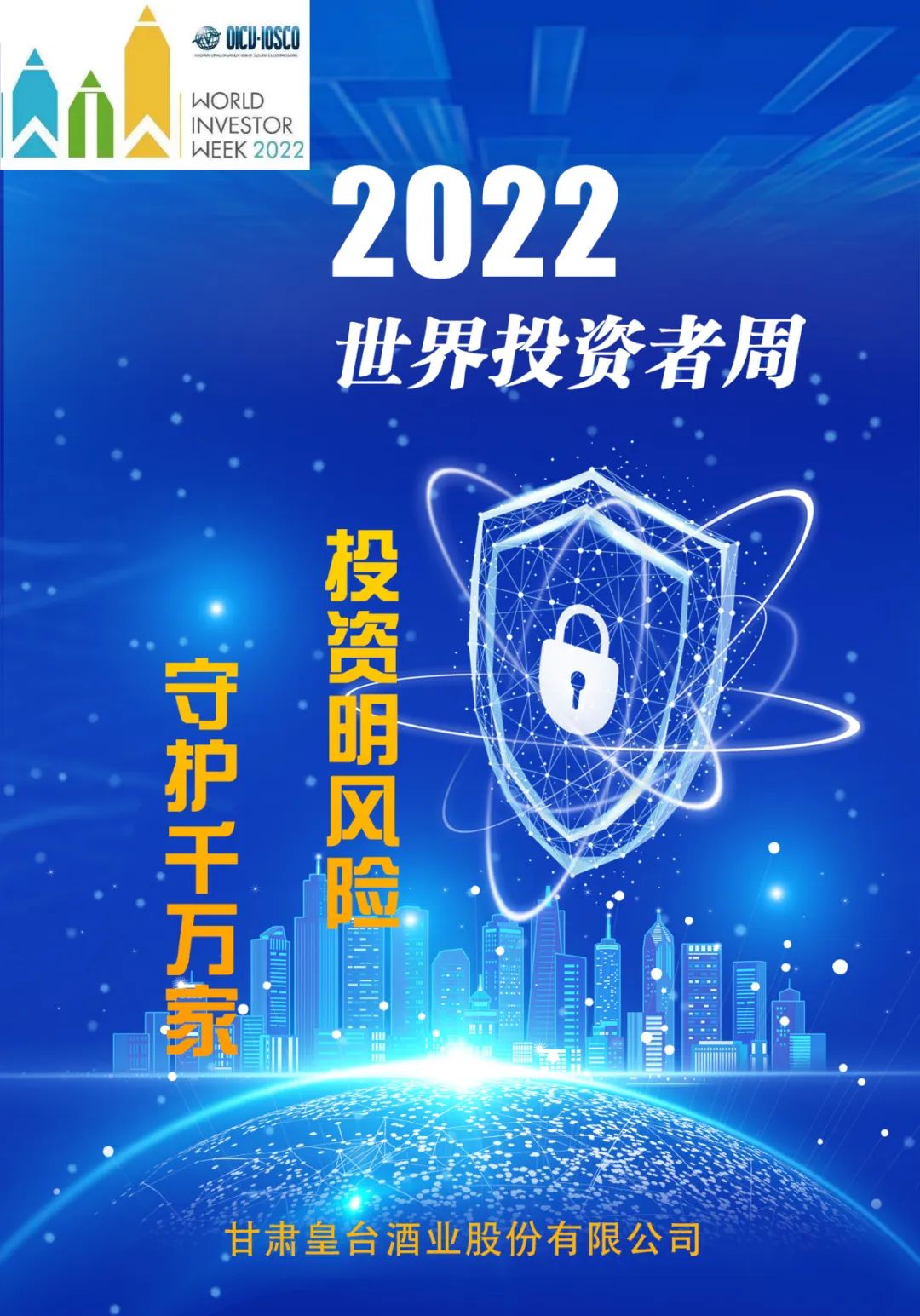 2022年10月8日-14日為“2022年世界投資者周”,本次活動主題為“投資明風(fēng)險,守護(hù)千萬家”。為貫徹落實監(jiān)管部門投資者保護(hù)工作的部署要求,加強(qiáng)投資者教育保護(hù)的國際交流合作,積極響應(yīng)“2022年世界投資者周”活動號召,皇臺酒業(yè)在監(jiān)管部門的指導(dǎo)下,將以“投資明風(fēng)險,守護(hù)千萬家”為主題,開展投資者教育和保護(hù)宣傳,面向投資者做好證券基金期貨知識宣傳普及,引導(dǎo)投資者學(xué)習(xí)金融知識,樹立正確投資理念!