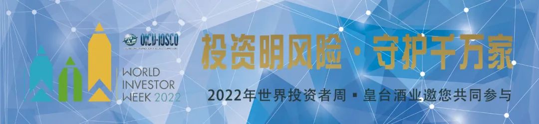 2022年10月8日-14日為“2022年世界投資者周”,本次活動主題為“投資明風險,守護千萬家”。為貫徹落實監(jiān)管部門投資者保護工作的部署要求,加強投資者教育保護的國際交流合作,積極響應“2022年世界投資者周”活動號召,皇臺酒業(yè)在監(jiān)管部門的指導下,將以“投資明風險,守護千萬家”為主題,開展投資者教育和保護宣傳,面向投資者做好證券基金期貨知識宣傳普及,引導投資者學習金融知識,樹立正確投資理念!